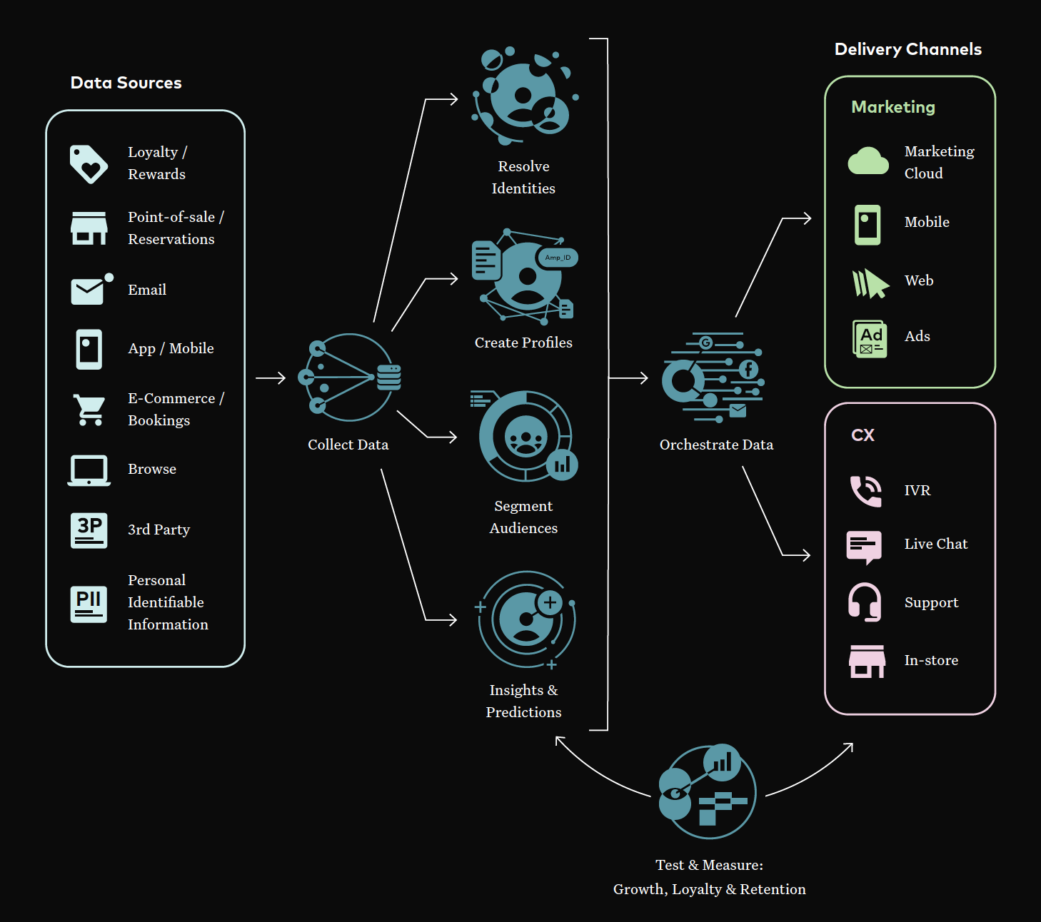 Last, but possibly most important, the combined customer data systems must support rapid measurement, learning, and iteration. This starts with the ingestion of all engagements and interactions in real time to power up-to-date metrics about customer and business health, including the ability to measure the results of campaigns or actions being taken.