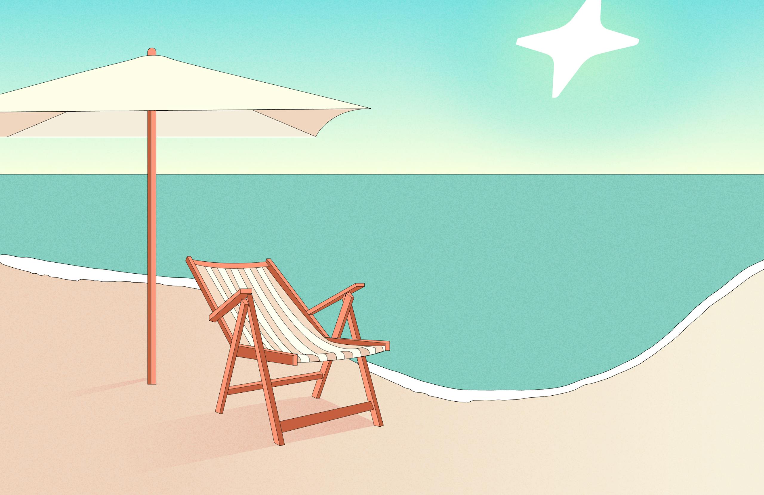 Colored lineart of a couple sunbathing by a hotel pool; in the background there's a mountain and a plane taking off